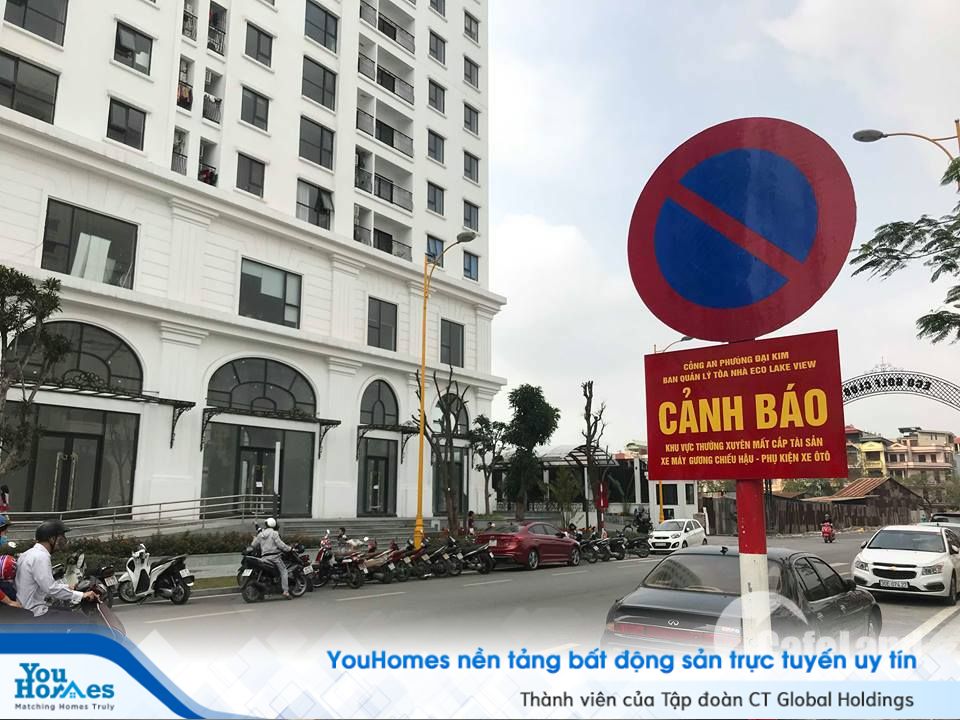 Biển cảnh báo ghi rõ: “Công an phường Đại Kim, Ban quản lý toà nhà Eco Lake View cảnh báo khu vực thường xuyên mất cắp tài sản, xe máy gương chiếu hậu, phụ kiện ô tô”.