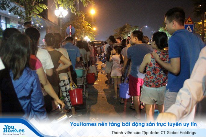 Người dân tại HH Linh Đàm tập trung lấy nước sinh hoạt về sử dụng.