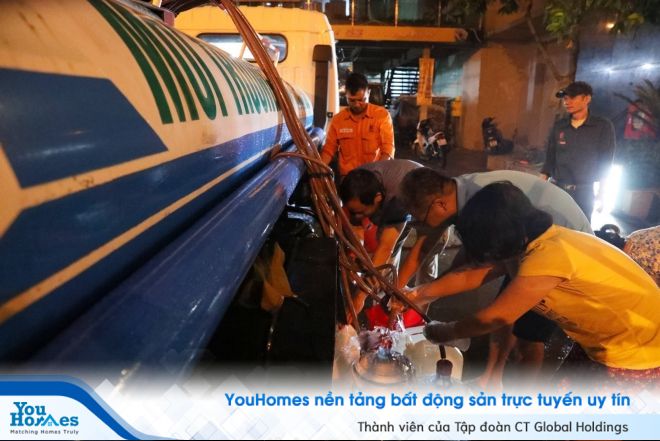 Theo đại diện nhà máy, đến 17h10, xe bồn đã thau rửa sạch sẽ và tiếp tục cấp nước đến chung cư HH Linh Đàm.