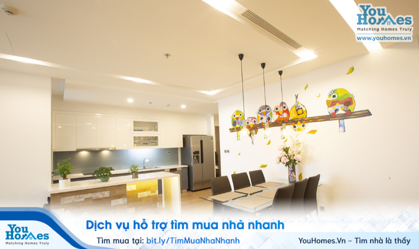 Trong thiết kế căn hộ chung cư 2 phòng ngủ để tạo nên một không gian tươi mới, thoáng đãng, khu vực bếp thường được thiết kế mở. Hiện nay phòng bếp thường được nối liền với phòng ăn và phòng khách bằng sự phân chia tinh tế hơn như thay đổi nền nhà, cây cảnh, cách sắp xếp đồ đạc… Phong cách của căn bếp phải hài hòa với không gian chung và ở đây thường thể hiện được cá tính của người phụ nữ trong gia đình. Nên quan tâm đến tủ bếp vì là nơi chứa tất cả đồ đạc cần thiết.