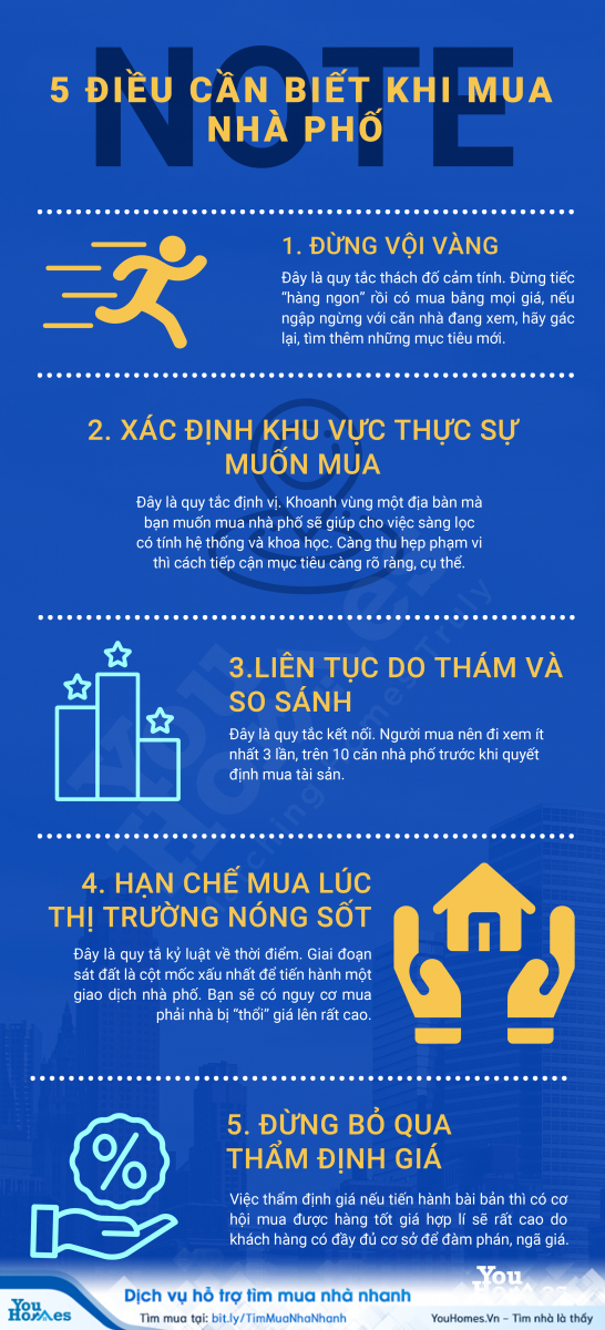 Khi quyết định mua bất cứ loại hình BĐS nào bạn đều cần cân nhắc kỹ lưỡng các yếu tố xung quanh ngôi nhà về giá cả, khu vực dân cư, tình hình thị trường BĐS trong thời gian bạn mua nhà, có nên mua nhà lúc thị trường đang nóng sốt hay không? Trong Infographic sau đây, YouHomes xin tổng hợp 5 yếu tố bạn luôn cần lưu ý khi quyết định mua nhà phố, tránh gặp phải những thiệt hại không đáng có.
