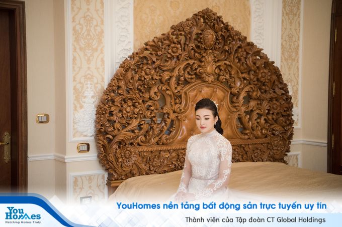Phòng ngủ của cô con gái nổi bật với chiếc giường gỗ, được chạm khắc rất cầu kỳ.