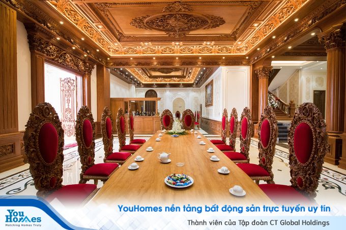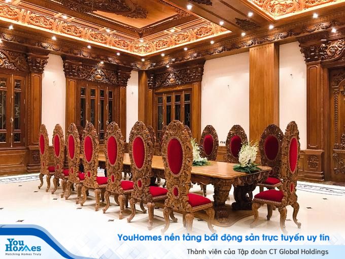 Không gian sinh hoạt chính của gia đình cũng mang hơi hướng cung điện thời xưa, với những chiếc ghế gỗ được chạm khắc tinh vi.