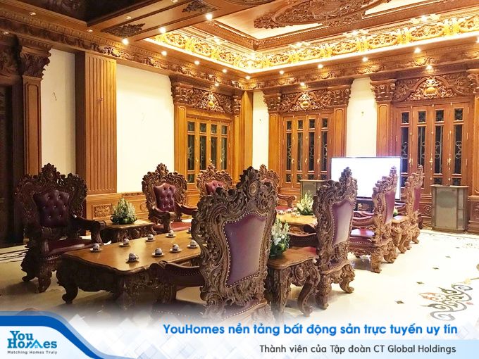 Khu vực tiếp khách được bố trí ghế gỗ nhung, mang nét hoàng gia, không hề kém những khách sạn hạng sang.