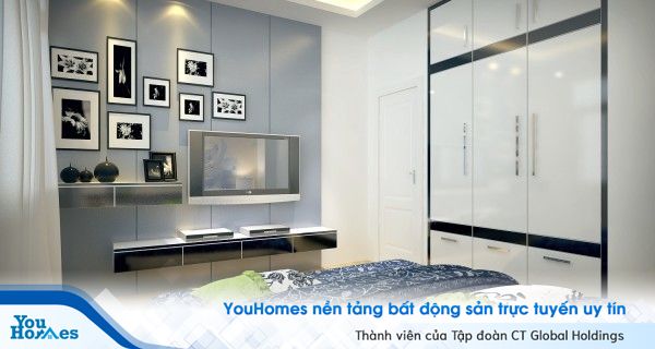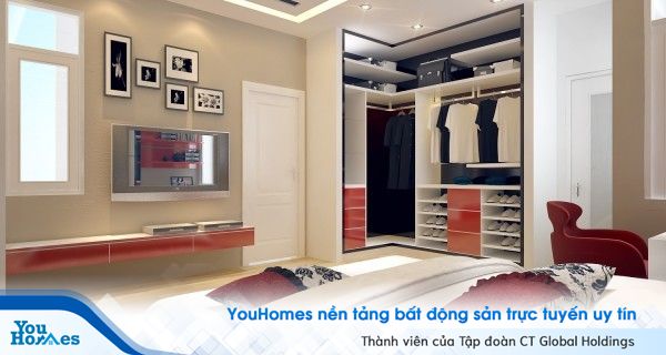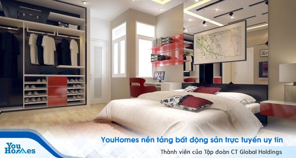 Phòng ngủ cho người độc thân có phong cách hiện đại và cá tính với gương ốp tường tạo chiều sâu và nhấn nhá bởi tông màu trắng đỏ.