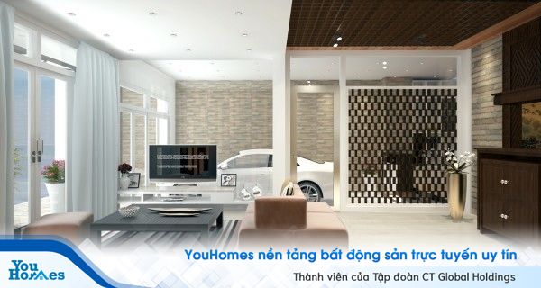 Cửa kính trong suốt được thiết kế kết hợp với vách ngăn gỗ và tường đá trang trí cách điệu ngăn đôi giữa phòng khách và khu vực để xe. Kiến trúc sư khuyên nên sử dụng nhiều mảng vật liệu cho từng không gian của biệt thự.