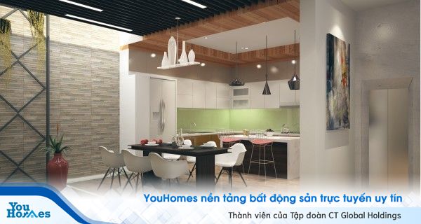 Nhà bếp với trần gỗ cách điệu, kết hợp giếng trời giúp không gian thoáng đãng, bớt đơn điệu. Hệ thống đèn chiếu sáng màu vàng ấm đem lại không khí ấm cúng cho các thành viên trong gia đình khi dùng bữa tại đây.