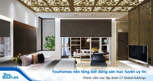 Phòng khách tích hợp phòng ngủ master có vách ngăn. Không gian này vừa có thể dùng để tiếp khách, vừa sử dụng làm bàn trà đạo thư giãn. Hệ thống đèn trang trí lạ mắt, tạo ánh sáng tinh tế, đem đến cảm giác ấm cúng cho căn phòng.