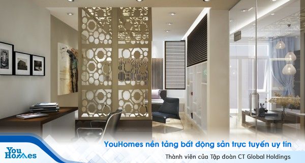 Phòng sinh hoạt chung với mảng trang trí họa tiết trên lam gỗ mang đến vẻ thanh mảnh, mềm mại cho không gian và hài hòa với tổng thể.