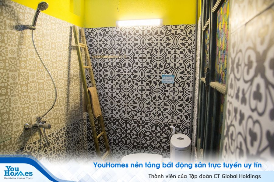 Dù vẫn là có những thiết bị phòng tắm hiện đại nhưng với cách trang trí tường bằng gạch bông đã tạo ra sự độc đáo và khác biệt cho khu vực này. Cùng với việc đặt thang tre có tác dụng treo khăn tắm đã giúp cho phòng tắm thêm tự nhiên và tiện lợi hơn.