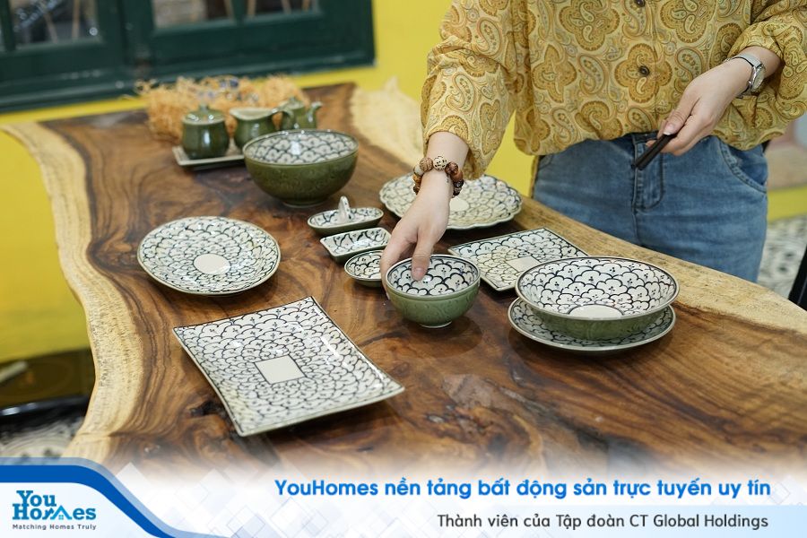 Bộ chén đĩa vẽ men xanh đầy tinh tế đúng như những gì mà gia chủ muốn truyền tải