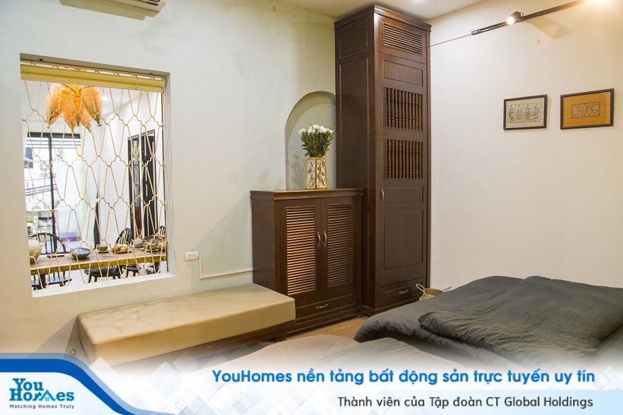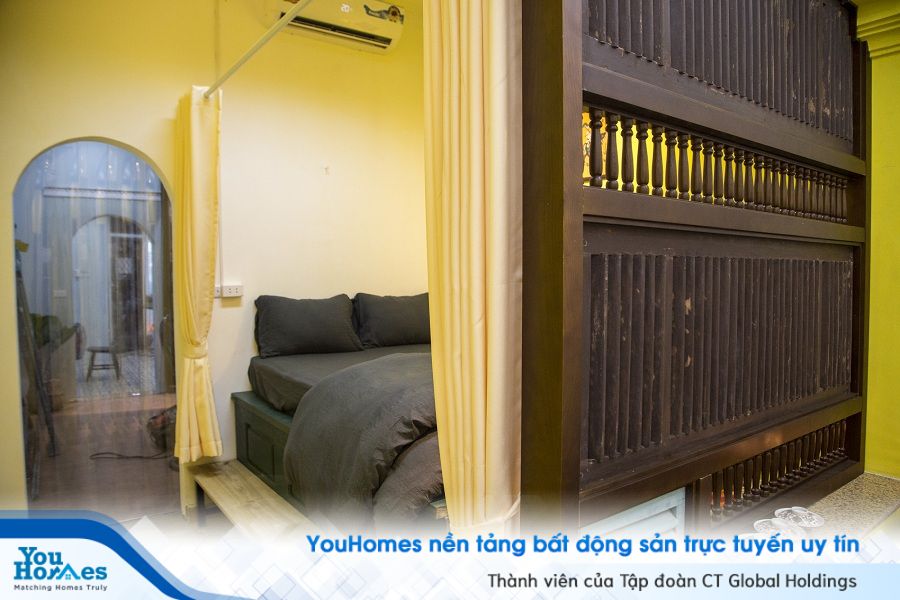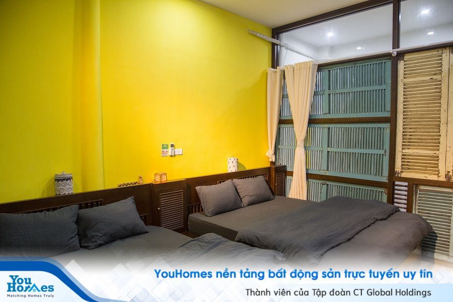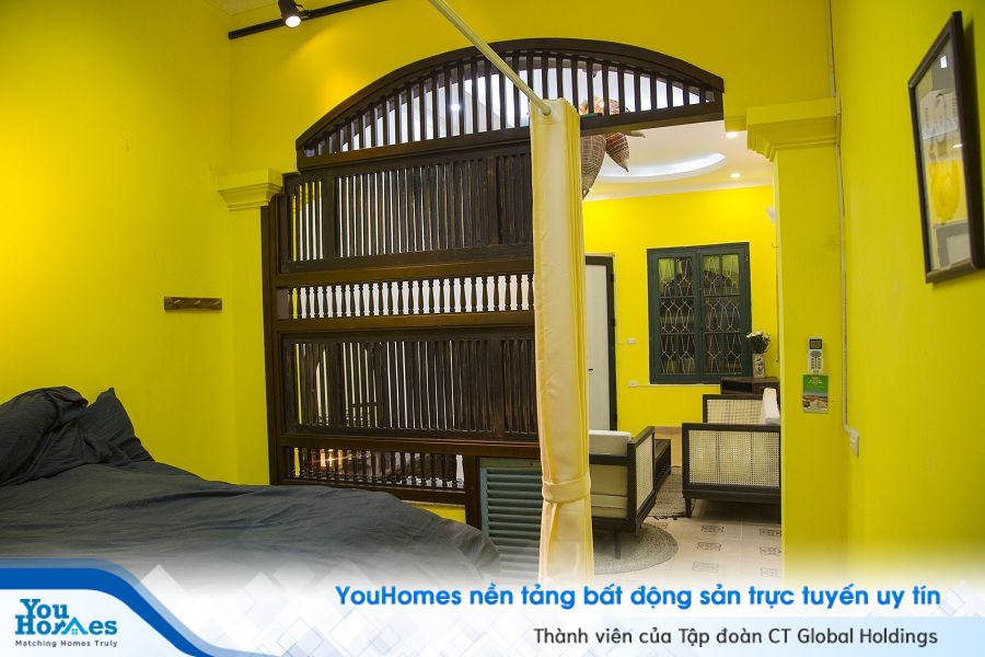 Ở phòng ngủ khác, mảng tường đầu giường được sơn vàng ươm như điểm nhấn không thể thiếu.Những vách ngăn phòng là những cánh cửa chớp kiểu cũ, đem tới sự thoáng đãng nhưng không kém phần kín đáo.