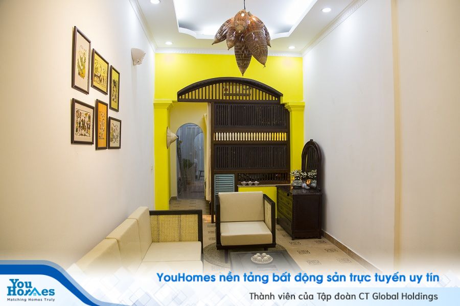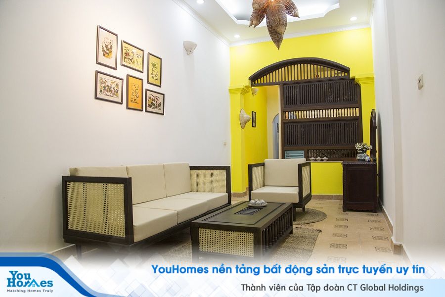 Một không gian tràn ngập sắc vàng, cùng những vật liệu chủ yếu là tre, gỗ… thô mộc đã tạo nên bầu không khí hoài cổ trong căn nhà.
