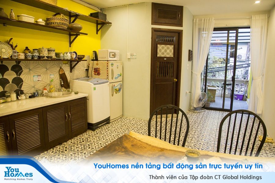 Phòng bếp là nơi thể hiện rất rõ những nét hoài niệm, cổ điển. Từ gạch bông lát cho tới đồ dùng trong bếp đã tạo nên bầu không khí hoài cổ cho căn bếp, bên cạnh những máy giặt, tủ lạnh... đầy tiện nghi.