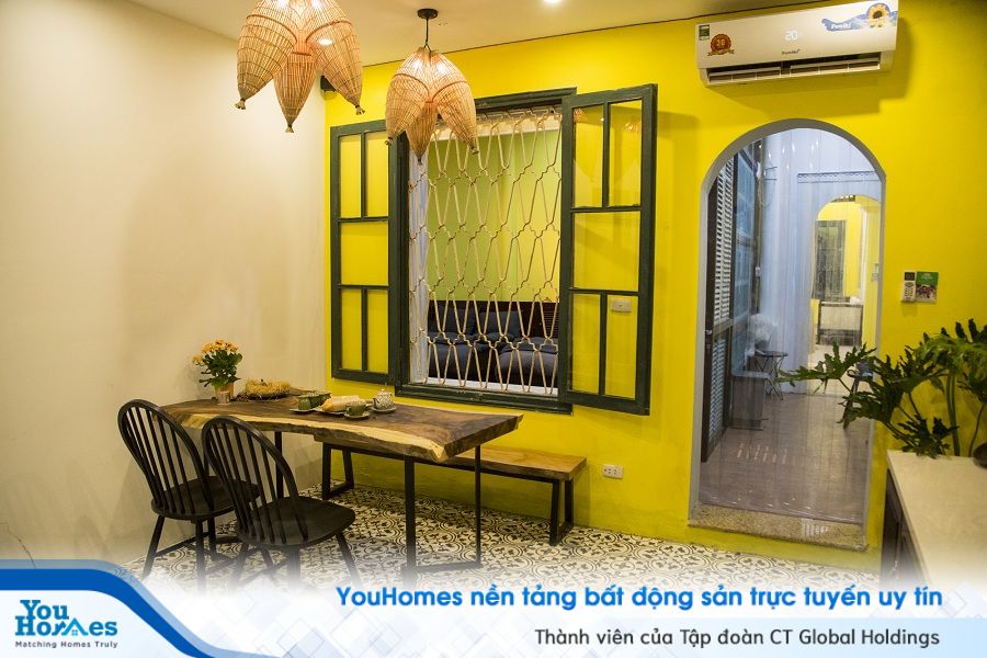 Chụp đèn treo bên trên bàn ăn kiểu dáng như chiếc lồng đặt cá gợi nhắc nhiều về cuộc sống thôn quê yên bình. Bàn ăn làm bằng gỗ ván, không gia công đem tới cảm giác ấm cúng, thân thuộc.