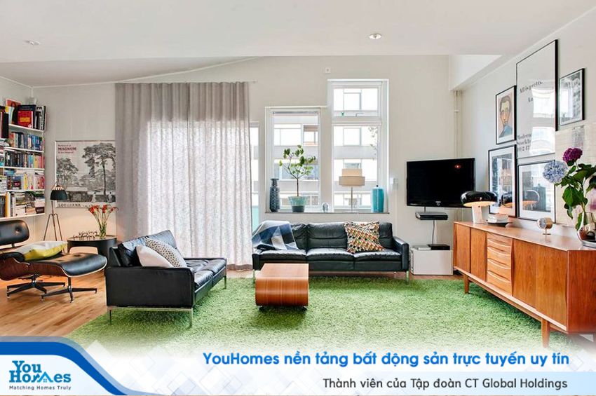 Phòng khách được bố trí khá đơn giản với bàn trà, kệ tivi, sofa được sắp xếp rất ngăn nắp nhằm tối ưu hóa không gian cho căn phòng. Gia chủ còn bố trí thêm thảm trải sàn màu xanh tươi và những bức tranh treo tường, những chậu cây nhỏ xinh đặt ở bệ cửa sổ… để tạo nên vẻ đẹp độc đáo, lạ mắt cho không gian. Căn phòng luôn tràn ngập ánh sáng thiên nhiên nhờ ô cửa sổ lớn với chiếc rèm mỏng để có thể tùy chỉnh ánh sáng. Chính những sự đơn giản này tạo nên những nét gần gũi cho căn hộ của bạn.