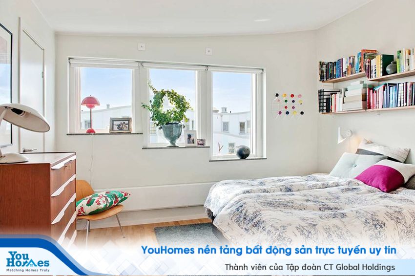 Phòng ngủ được bố trí gọn gàng với kệ gắn tường lưu trữ sách. Một phần những bức tường được phá bỏ để lắp đặt cửa kính, giúp ánh sáng tự nhiên tràn ngập khắp căn phòng.