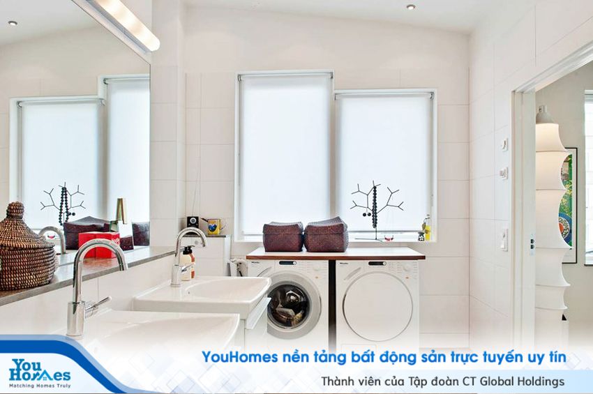 Với diện tích rộng rãi như vậy, gia chủ có thể sử dụng bồn rửa đôi, máy giặt, máy sấy quần áo,... vô cùng tiện nghi.