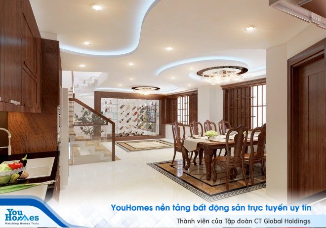 Nhà phố 4 tầng kèm 1 tầng lửng mang phong cách bán cổ điển với đồ nội thất gỗ cao cấp mang lại cho ngôi nhà sự sang trọng và tinh tế.