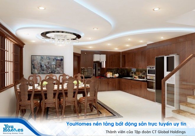 Không gian bếp và phòng ăn trên tầng lửng của ngôi nhà cũng mang thiết kế khá rộng rãi với phần tường ốp thạch cao lượn sóng mềm mại. Đèn treo trên trần giúp tối ưu hóa không gian sử dụng. Phong cách thiết kế của phòng bếp cũng là hơi hướng truyền thống chủ đạo cùng bàn ghế gỗ họa tiết chạm khắc tinh tế.