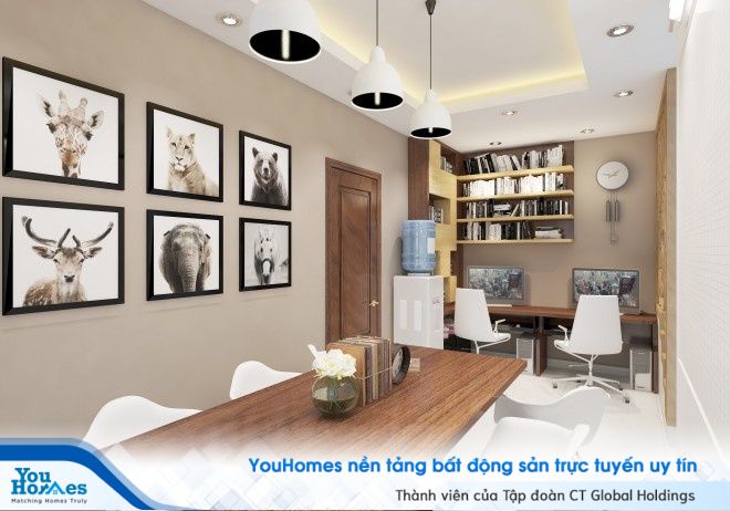 Khu vựa học tập và làm việc của các thành viên trong gia đình được trang bị đầy đủ máy tính và giá sách tiện lợi. Bên cạnh khu vực đọc sách được trang trí thêm nhiều hình các loại động vật cực kỳ sinh động giúp các bé có thêm được cảm hứng khi học tập và sáng tạo.