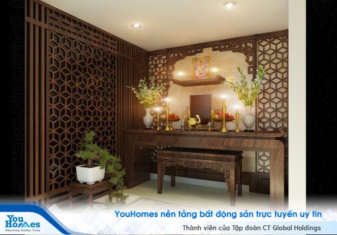 Khu vực phòng thờ trang trọng được lát gỗ làm nên một không gian thanh tịnh, kín đáo. Chủ nhà cũng bố trí thêm một cây cảnh bonsai giúp cho khung cảnh trở nên ấm áo và gần gũi hơn.