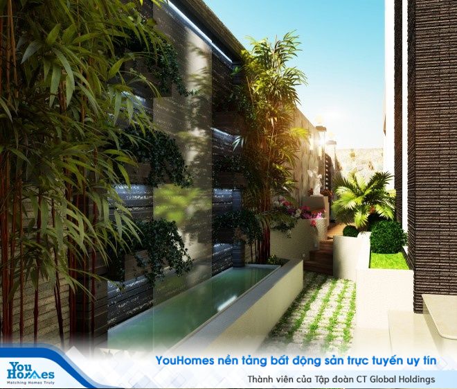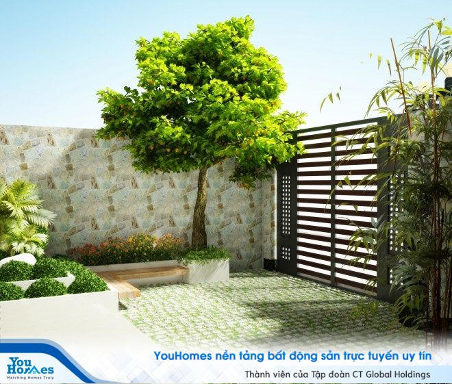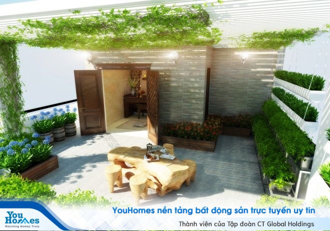 Phần không gian sân vườn của căn nhà phố cũng đượ chủ nhà rất chú trọng đầu tư với phần tiểu cảnh và vườn cây xanh mát. Bộ bàn ghế cũng được ứng dụng từ gỗ tự nhiên với hình thế cực kỳ thú vị, làm cho căn nhà trở nên gần gũi hơn với thiên nhiên, cây cỏ.
