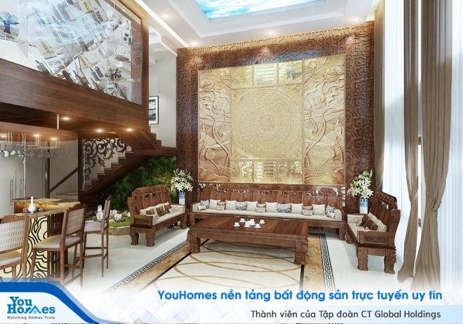 Ngôi nhà sở hữu diện tích 8,1 x 23 m, khá phù hợp cho một gia đình 4 người sinh sống. Phòng khách mang đặc hơi hướng thiết kế truyền thống với mảng tường được trang trí bằng đồng và gỗ theo họa tiết trống đồng và hoa sen cách điệu cực kỳ nổi bật và đẹp mắt. Bàn ghế phòng khách cũng được ứng dụng gỗ tự nhiên mang nét thiết kế cổ điển Á Đông đem lại chất riêng khác biệt.