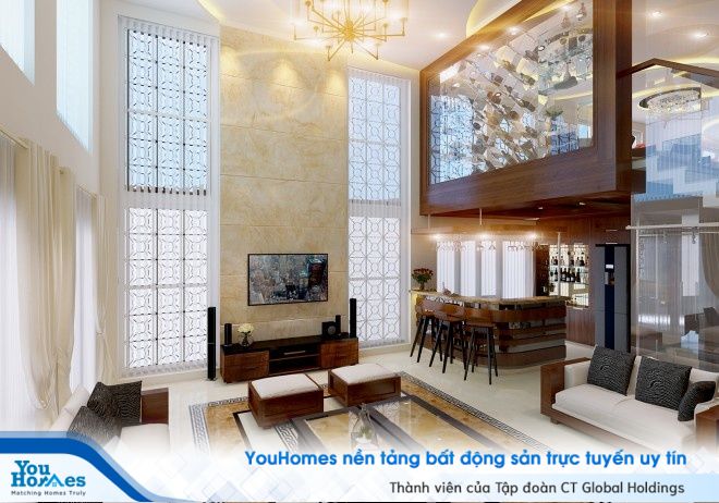 Một góc phòng giải trí để gia đình có thể quây quần cùng nhau xem tivi và trò chuyện. Bên cạnh là phần quầy bar được thiết kế cực kỳ hợp lý giúp người sử dụng có thể dễ dàng lấy những chai rượu ưa thích của mình. Bên trên tầng lửng được ngăn cách bằng kệ để rượu bằng kính cực kỳ tiện dụng và cũng là một đồ trang trí đẹp mắt cho căn nhà.