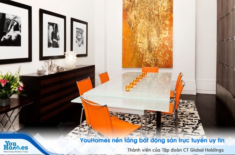 Nên đặt bức họa đối diện với khu vực bán ăn để tất cả mọi người có thể thưởng thức. Lựa chọn màu sắc cho bàn ăn phù hợp với màu sắc cho bức họa cũng làm nên một tổng thể tuyệt vời cho khu vực bàn ăn.