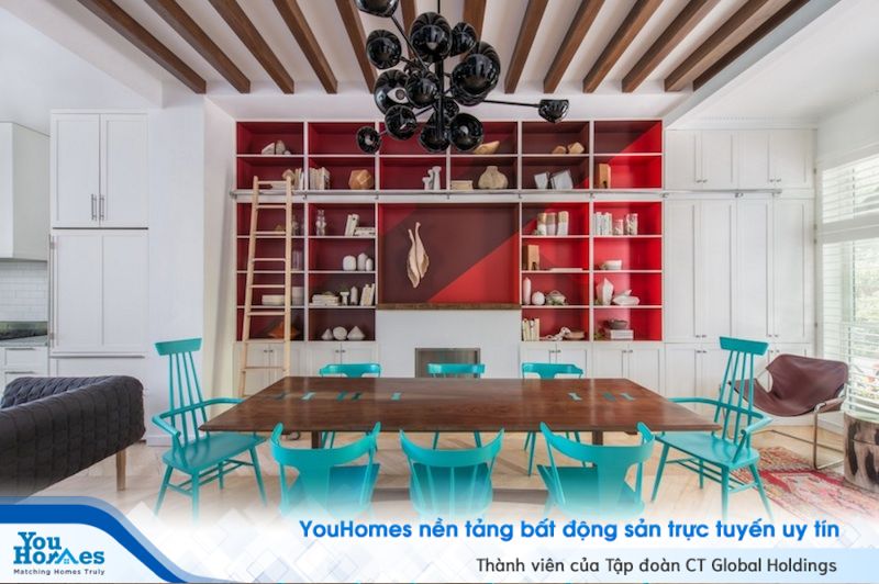 Bạn muốn sở hữu một phòng ăn độc đáo với cách phối màu sắc đặc trưng đầy cá tính? Hãy thử thảy đổi màu sắc cho những kệ tủ và những chiếc ghế trong khu vực bàn ăn, bạn sẽ phải bất nhờ vì hiệu ứng màu sắc có được. Lựa chọn thiết kế đèn độc đáo với hình thù lạ mắt cũng sẽ tạo nên được tổng thể căn phòng cực kỳ đặc sắc.