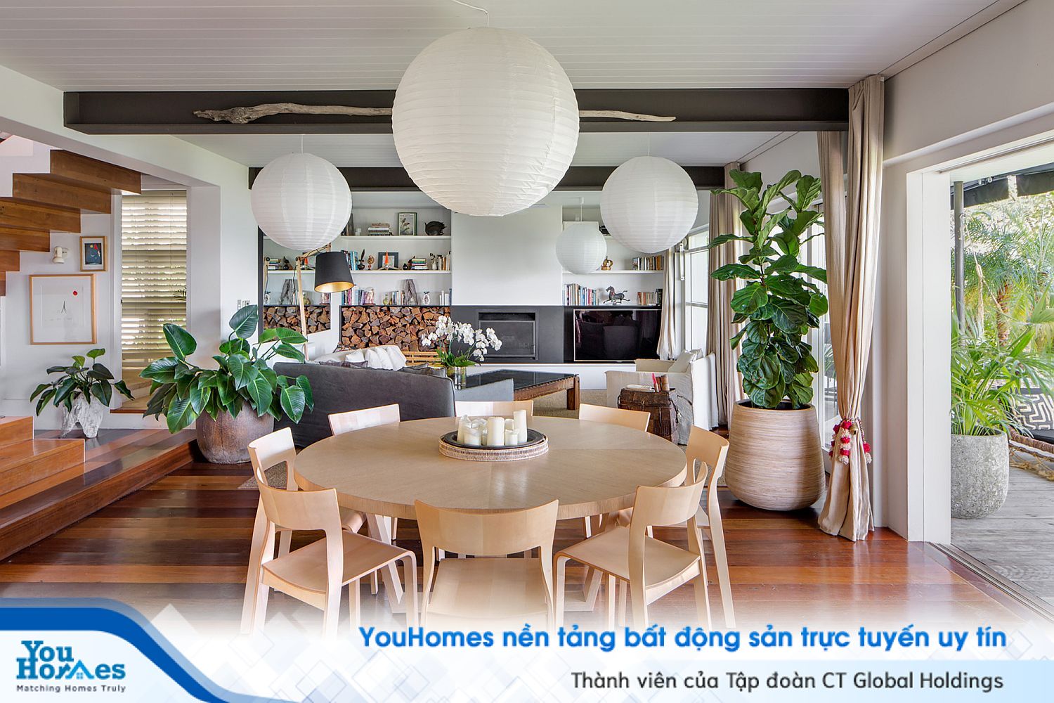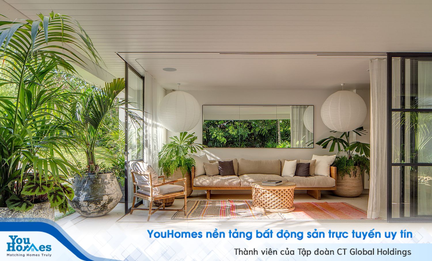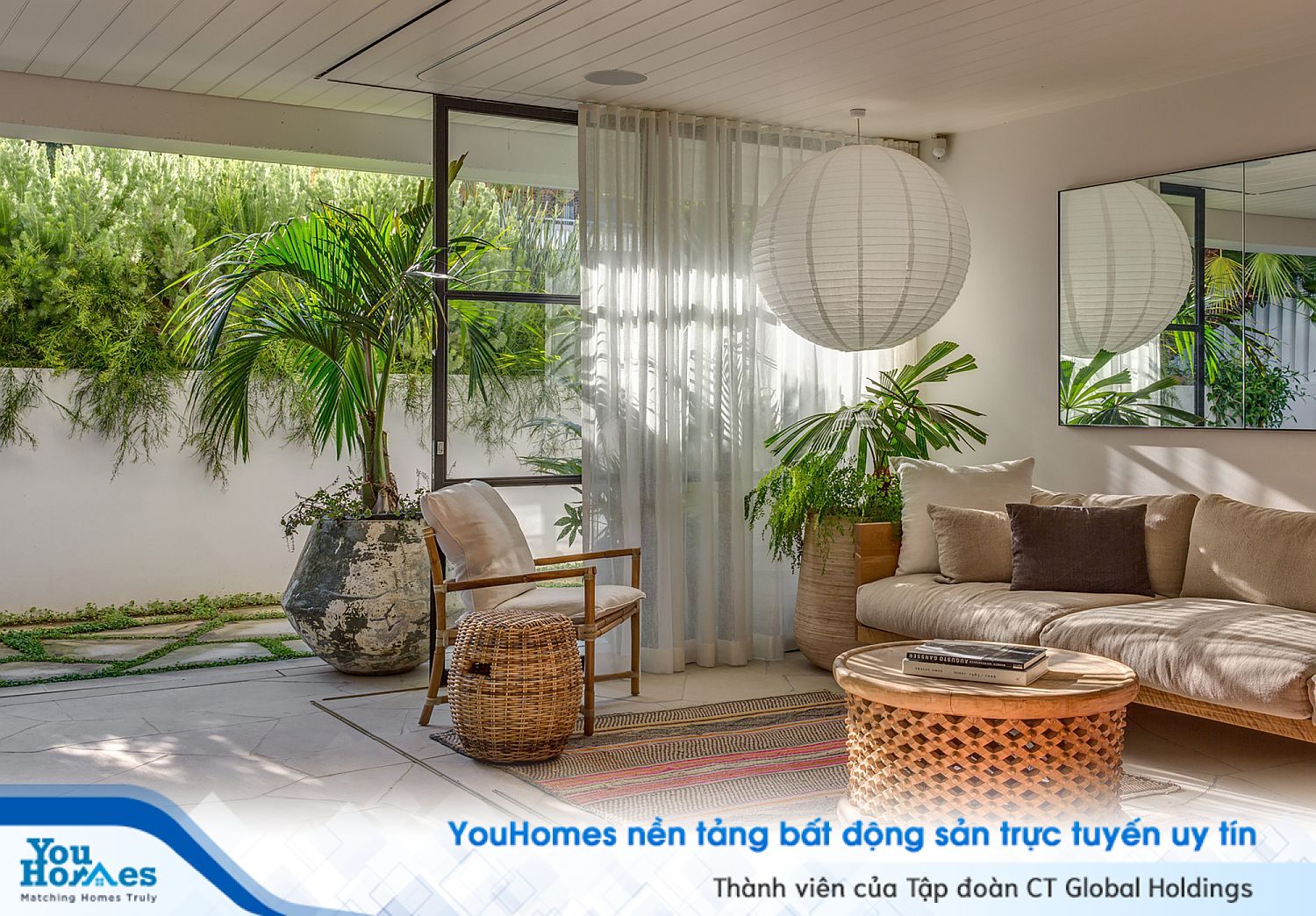 Phòng khách nổi bật với sự thoáng mát và màu gỗ ấm áp. Kết hợp cùng cây xanh tạo nên sự tinh tế trong sự kết hợp màu sắc.