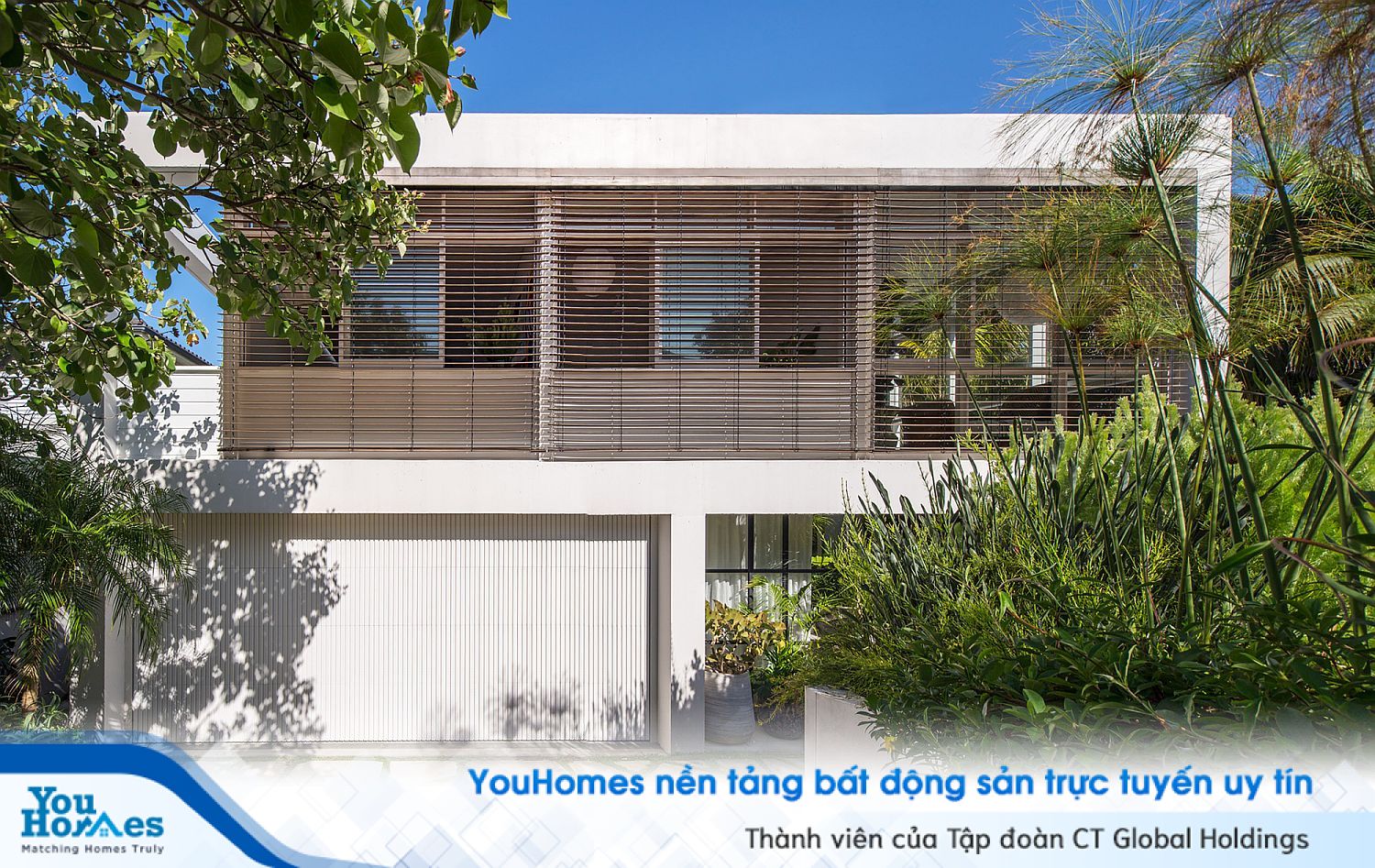 Không gian ngoài trời màu trắng và thanh lịch với nhiều màu xanh lá cây.