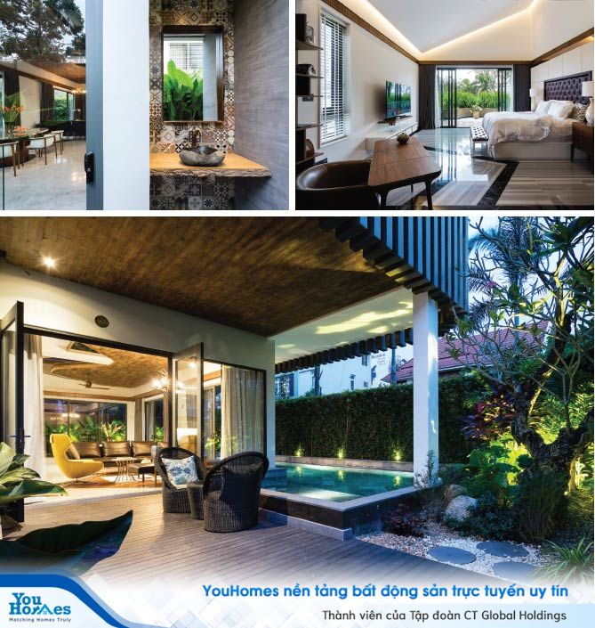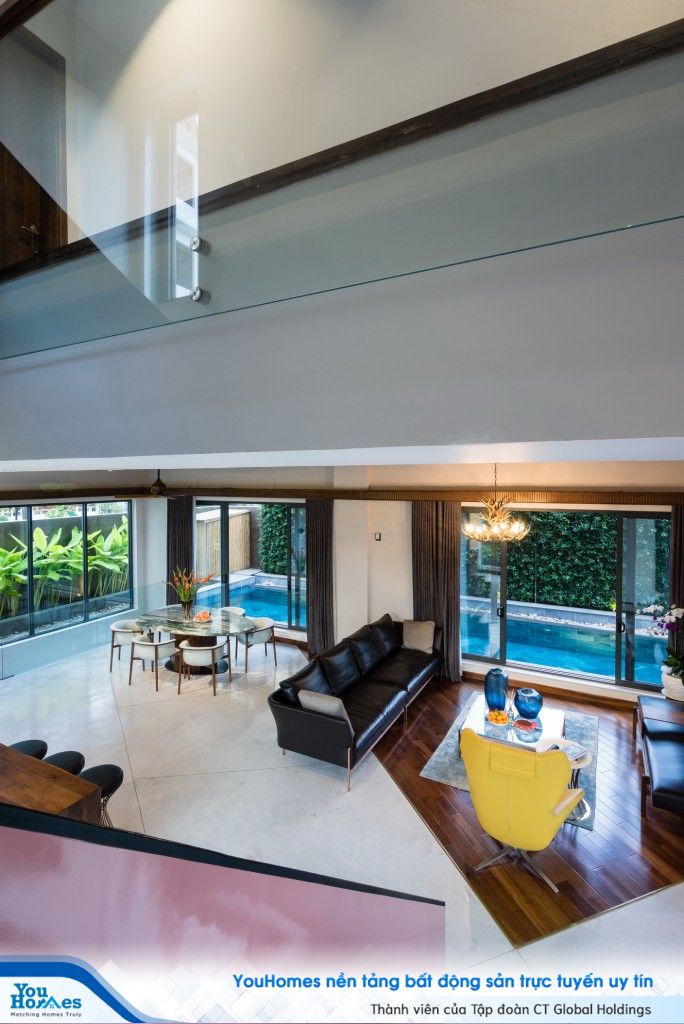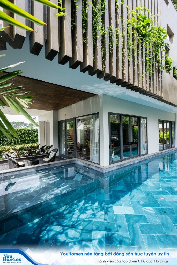 Tọa lạc trên ngã ba đường với một quỹ đất không quá lớn, nhiều chức năng như hồ bơi, xông hơi, vườn, deck nghỉ ngoài trời vẫn được bố trí đầy đủ. Hồ bơi ngay phía trước và bên hôn nhà được kết nối vào bên trong qua hai khung cửa kính lớn: một mở ra từ phòng khách và một từ cụm bếp – quầy bar – bàn ăn. Vì gia chủ muốn có một không gian mở do đó toàn bộ không gian tầng trệt được thiết kế để mở, bố trí thuận tiện cho sinh hoạt khi đông người và các bữa tiệc.