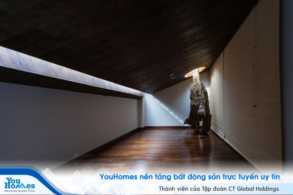 Từ lớp vỏ bọc kín đáo ngoài cùng như một chiếc đèn lồng, khi bước vào bên trong, toàn bộ không gian lại được mở ra thênh thang, tràn ngập ánh sáng và cởi mở. Nhưng ở những khu vực sinh hoạt chung, sẽ khó có thể quan sát được toàn bộ thế giới riêng của từng tầng. Một sự kín đáo được tạo ra qua những lát cắt, cách đóng – mở liên tục cho ngôi nhà. Tuy nhiên, cuối cùng, khi bước vào bên trong mỗi phòng ngủ, lại mở những góc sống chan hòa với thiên nhiên khi đều có khoảng vườn riêng. Tất cả tạo thành một chuỗi những trải nghiệm thú vị khi phám phá không gian sống từ ngoài vào đến tận những nơi riêng tư bên trong.