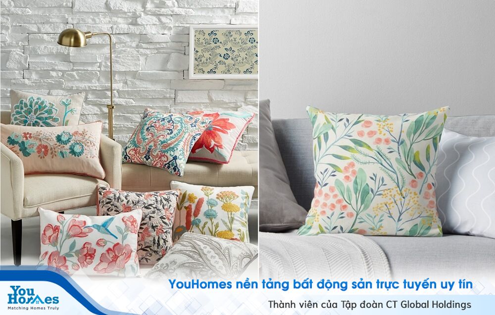 Những họa tiết in, thêu thực vật nơi gối ôm trên ghế sofa phòng khách.