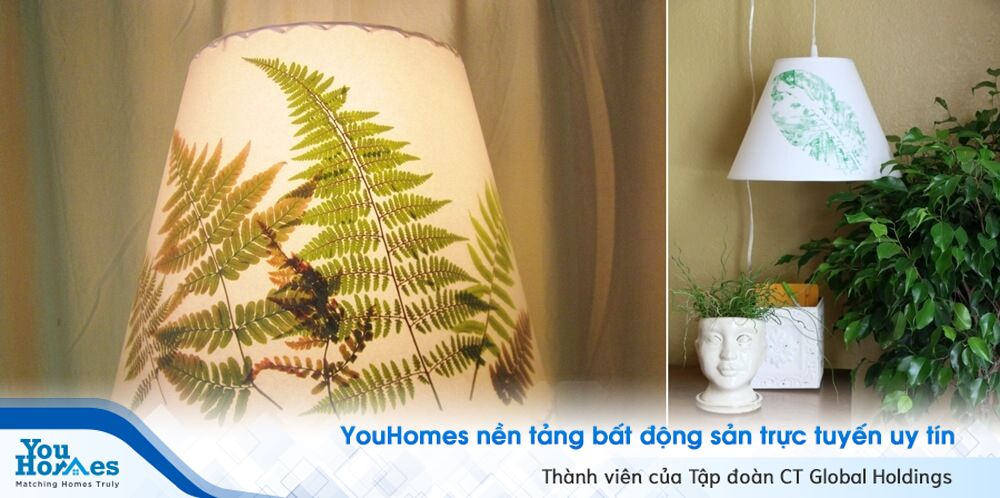 Trang trí một đèn bằng cây dương xỉ, bạn cũng có thể đóng dấu một chiếc lá bằng sơn vải.