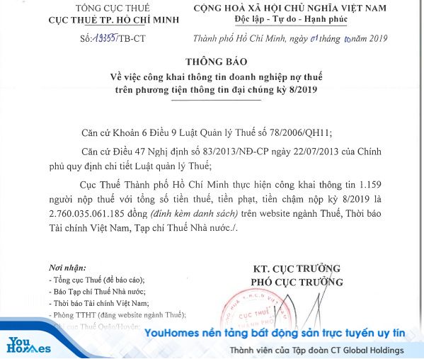 Cục Thuế TP.HCM vừa công bố danh sách hơn 1.150 doanh nghiệp nợ thuế với tổng số tiền thuế, phạt, nộp chậm lên đến hơn 2.760 tỷ đồng, trong đó có nhiều ông lớn của ngành bất động sản.