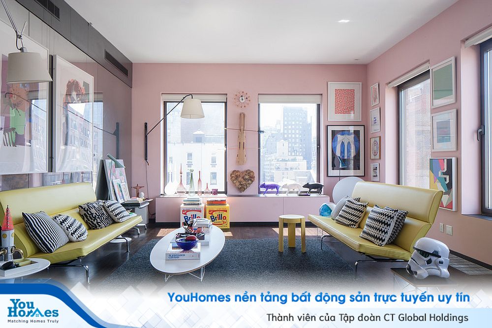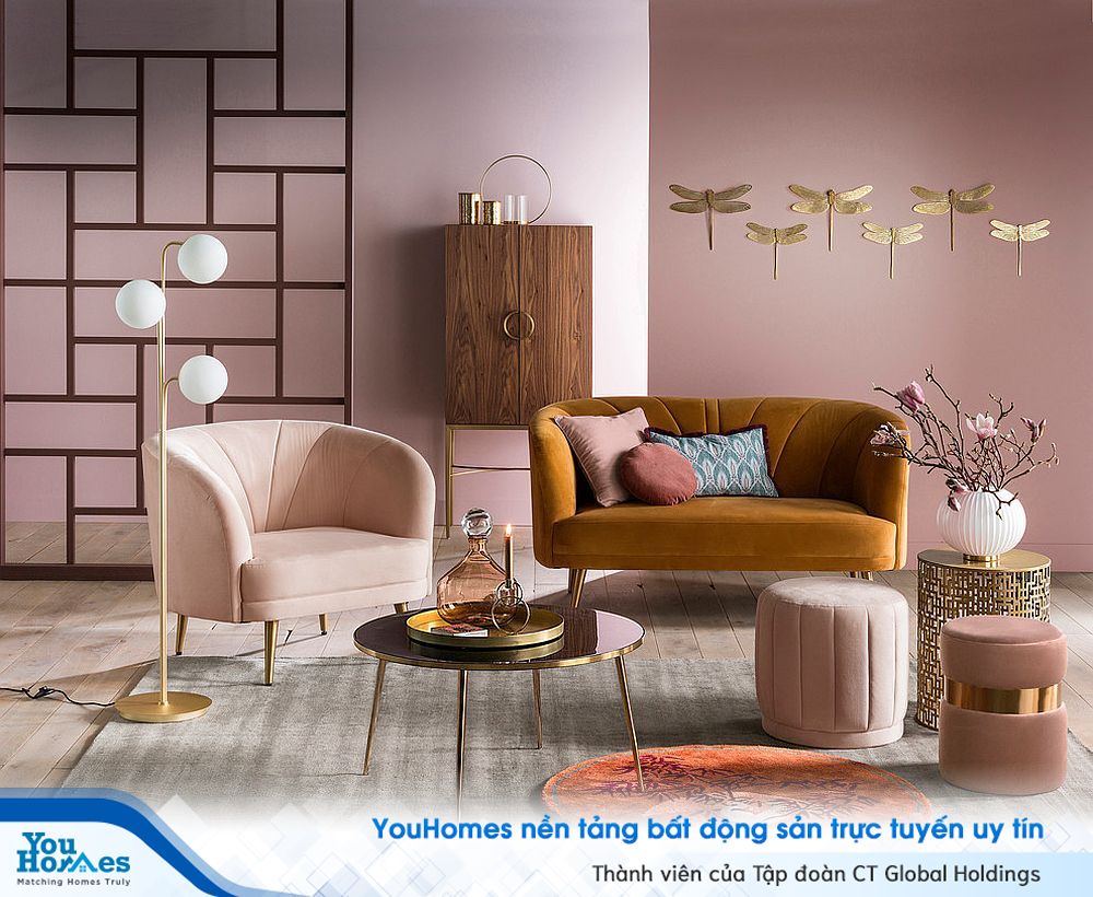 Màu hồng mộng mơ cho phòng khách hiện đại