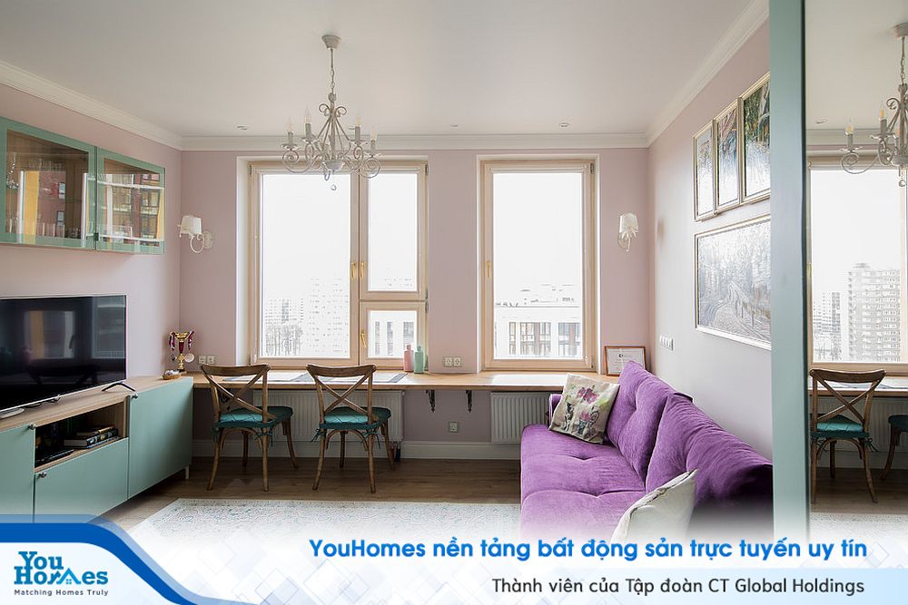 Phòng khách nhỏ màu hồng ngập tràn trong ánh sáng tự nhiên từ cửa sổ lớn từ. Một bàn dài được đặt cạnh cửa sổ để tiện cho việc làm việc của gia chủ. Ghế sofa mềm mại màu tím nổi bật kết hợp với tầm thảm họa tiết bắt mắt tạo nên một không gian hoản hảo. Gia chủ có thể ngồi trên ghế sofa phóng tầm mắt ra phía bên ngoài của sổ để có thể tận hưởng những giây phút bình yên.