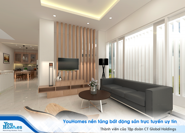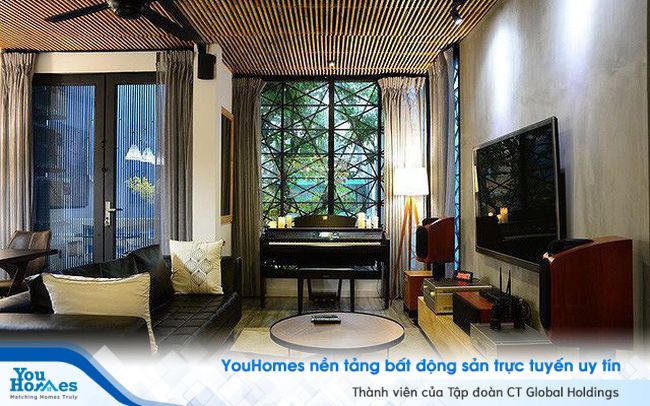 Sự tỉ mỉ, sắc sảo của không gian ngôi nhà đem đến một giá trị đặc biệt. Gam màu gỗ trầm ấm cùng ánh đèn vàng phảng phất trong không gian căn phòng toát lên sự gần gũi, thân thuộc và vô cũng ấm áp. Chiếc ghế sofa lớn màu đen sang trọng đặt đối diện kệ tivi nhỏ. Những thanh lam trang trí trên trần nhà tạo chiều sâu cho căn nhà.
