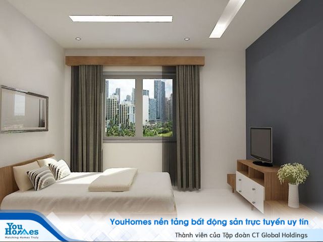 Sau những giờ làm việc mệt mỏi thì không gian phòng ngủ khá quan trọng để đem lại những giấc ngủ ngon cho gia chủ. Những bức tường trắng tạo nên sự liền mạch, phóng khoáng, rộng rãi cho không gian, mang đến vẻ đẹp thuần khiết, tinh khôi một cách triệt để nhất. Một điều quan trọng nữa, so với các gam màu khác, thì màu trắng sẽ tạo cho căn phòng một vẻ đẹp gọn gàng, thoáng sáng. Tạo điểm nhấn cho căn phòng là bức tường màu xám đậm cùng với kệ tivi gỗ tiện lợi. Cửa sổ nhỏ cung cấp ánh sáng cho cả căn phòng. Rèm cửa màu đậm nổi bật giúp tùy chỉnh ánh sáng phù hợp.
