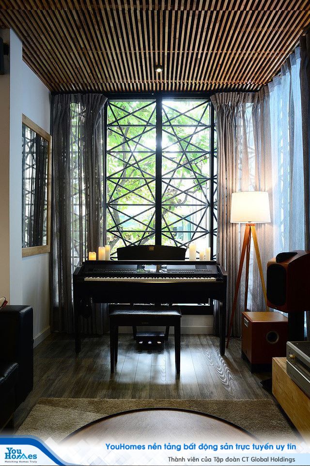 Chiếc đàn được đặt cạnh cửa sổ kính giúp tận dụng được ánh sáng thiên nhiên. Vừa đàn vừa ngắm khung cảnh thiên nhiên tạo nên một không gian thư giãn tuyệt vời.