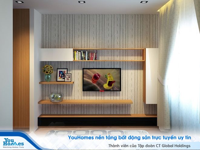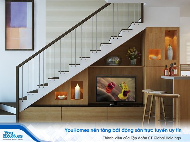 Đối diện với ghế sofa là kệ tivi đẹp mắt. Để tối ưu diện tích của ngôi nhà thì cấu thang được thiết kế sát tường. Tận dụng khoảng không gian dưới cầu thang thiết kế kệ tivi. Kệ tivi bằng gỗ kết hợp với ánh đèn vàng từ các ô nhỏ mang đến cảm giác ấm áp. Kệ tivi có nhiều ngăn nhỏ giúp lưu trữ được các đồ vật nhỏ giúp phòng khách gọn gàng và ngăn nắp hơn.