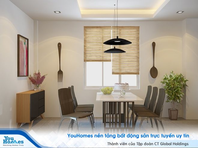 Phòng ăn được thiết kế đơn giản nhưng toát lên vẻ đẹp hiện đại. Cửa sổ kính giúp căn phòng tận dụng được tối đa ánh sáng thiên nhiên. Điểm nhấn độc đáo của phòng ăn là hai đồ vật trang trí: muỗng và dĩa. Hai đồ vật vốn là những vật dụng quen thuộc trong căn bếp nên chúng đem lại cảm giác quen thuộc, gần gũi. Chậu cây cảnh đặt trong phòng bếp giúp điều hòa và cân bằng không khí trong phòng.