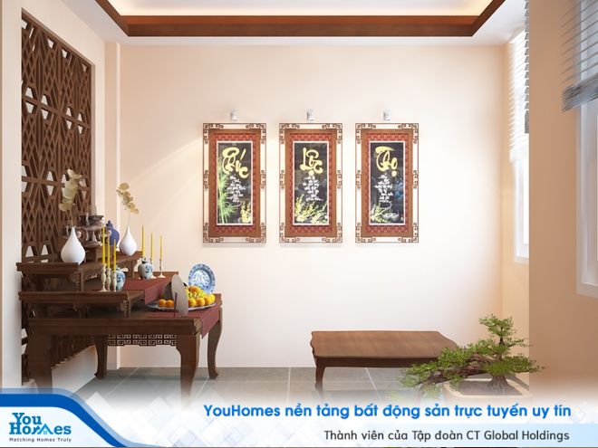 Phòng thờ được thiết kế trang nghiêm trên tầng 2. Có các cửa sổ để giúp phòng thờ thoáng đãng hơn.