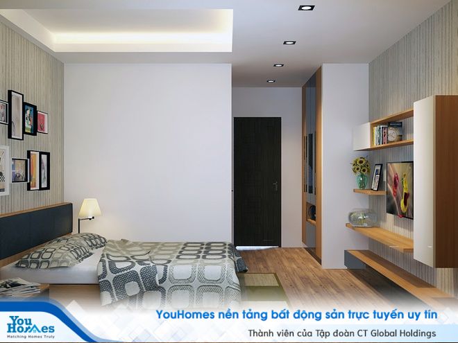 Tầng lửng là phòng của bố mẹ được thiết kế màu sắc trang nhã, nhã nhặn. Gam màu trung tính, nhẹ nhàng mang lại cảm giác thư giãn giúp cho gia chủ có những giấc ngủ ngon. Những bức tranh kỉ niệm của gia đình được trang trí trên tường. Kệ tivi bằng gỗ kết hợp với sàn gỗ hiện đại mang lại một tổng thể hài hòa. Nên thiết kế tầng lửng cao 2,8m với 17 bậc thang để giảm sự di chuyển lên cao, giải pháp này đảm bảo sự riêng biệt, phòng ngủ tiện nghi nhưng không phải đi lại nhiều.
