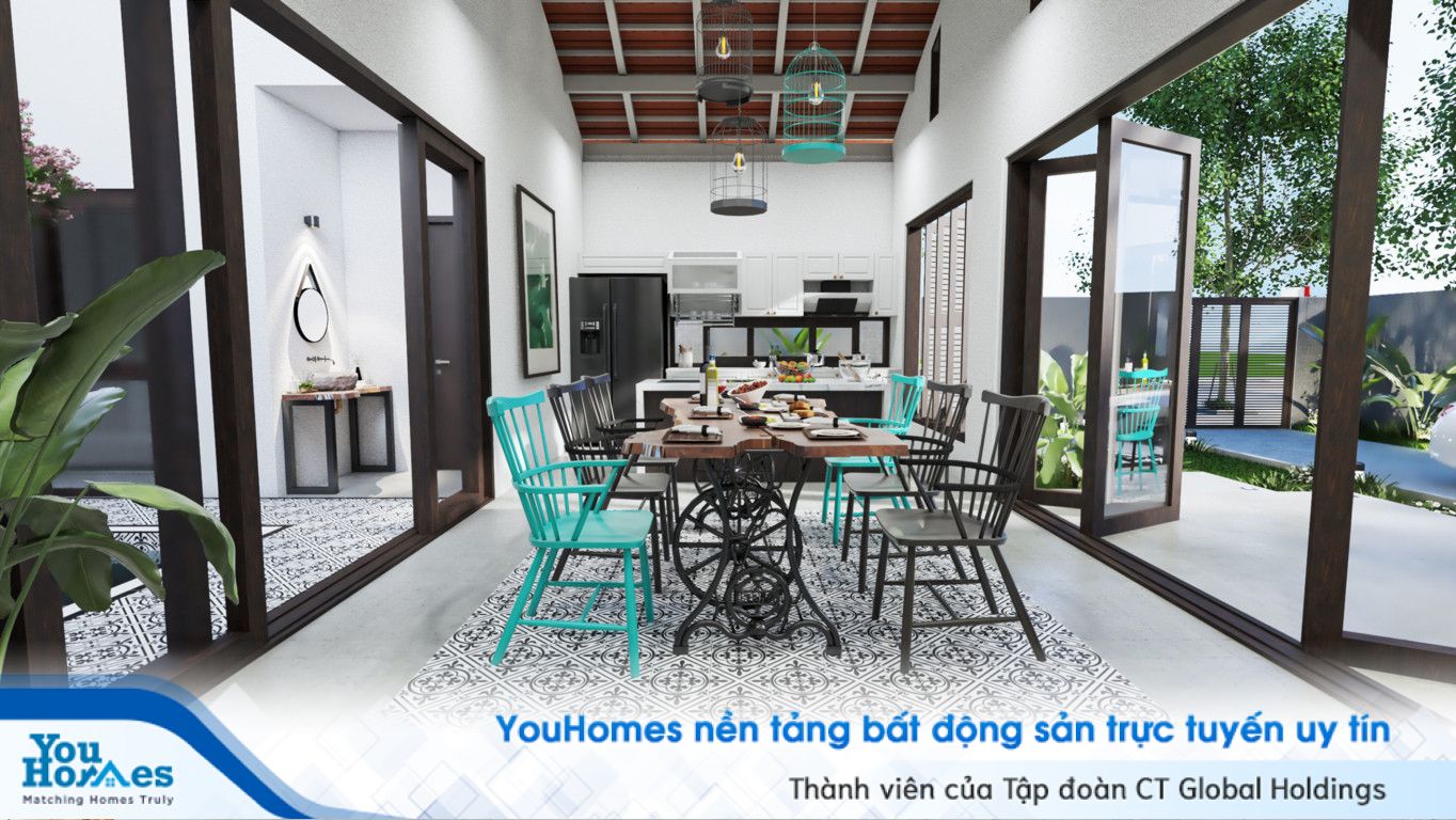 Phòng ăn được thiết kế hiện đại với không gian mở nhìn ra phía ngoài xanh mát. Nhờ những ô cửa kính thoáng mát giúp gia chủ có thể ngồi trong phòng ăn nhưng vẫn ngắm được cảnh thiên nhiên bên ngoài ngôi nhà. Phong cách hiện đại mang hơi hướng của phong cách indochina. Màu sắc trầm nhã nhặn sang trọng với điểm nhấn là 2 chiếc ghế màu xanh da trời. Giúp không gian trở nên bắt mắt thú vị và không bị nhàm chán.