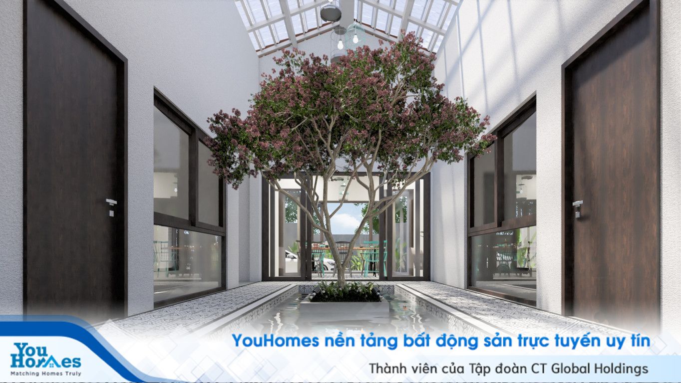 Từ phòng ăn, phía tay trái là phòng khách, phía tay phải là bếp nấu, đi sâu vào trong, chính giữa nhà là hồ nước và tiểu cảnh, 4 phòng ngủ được thiết kế đồng đều và phân bố xung quanh hồ nước. Tiểu cảnh được cung cấp ánh sáng thiên nhiển từ tấm lợp trong suốt trên mái nhà. Tiểu cảnh đẹp, bắt mắt vừa giúp trang trí ngôi nhà thêm sinh động vừa tốt cho phong thủy ngôi nhà.
