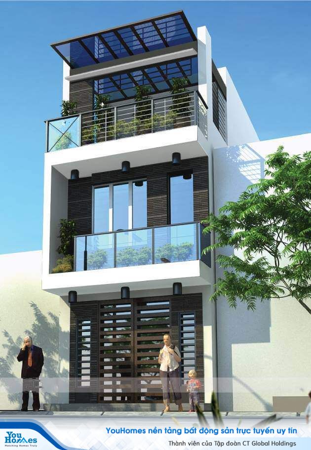 Ngôi nhà thu hút ánh mắt của biết bao người qua đường nhờ thiết kế đơn giản mà vẫn toát lên vẻ đẹp hiện đại, sang trọng. Sự kết hợp hài hòa, khoa học trong thiết kế nội ngoại thất và sử dụng màu sắc của mẫu nhà ống 2 tầng 1 tum này đã tạo nên một ngôi nhà thẩm mỹ từ nghệ thuật đến không gian sống. Thiết kế độc đáo tầng tum nhỏ có thể được tận dụng làm phòng thờ và sân phơi. Giếng trời sẽ giúp ngôi nhà luôn ngập tràn ánh sáng thiên nhiên, giúp tiết kiệm được năng lượng chiếu sáng trong căn nhà.